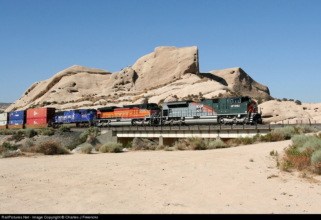 The Western Pacific heritage unit leads the Southern Pacific heritage unit and one of the Salt Lake City Olympic units with a 12,000 foot long intermodal train at Mormon Rocks. I need to thank RayH for saving me on this shot... which I nearly drove away from... he caught me (seeing me for the first time in 31 years), said "It's on the SP," turned me around, and when I stood there befuddled, got me to point my camera at the tracks just in time to take my picture. This grab shot turned out better than any of my planned images.