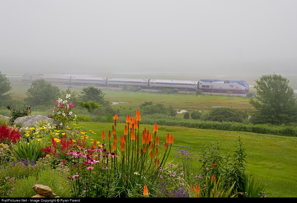 | Amtrak's Downeaster passes through thick fog along the marshes in Scarborough, ME, heading south for it's next station stop at Old Orchard Beach. |