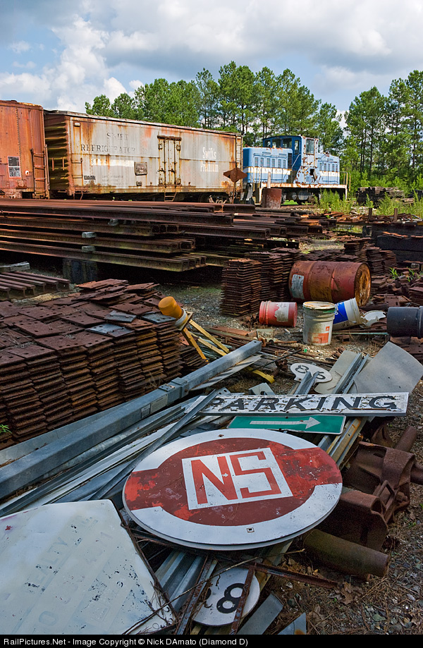 | Odds and ends, including a sign with the logo of the original NS, surround these interesting relics on display at the New Hope Valley RR in rural NC. |