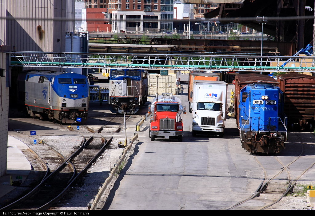 AMTK power resting between runs, NS switching local industry while trucks making deliveries
