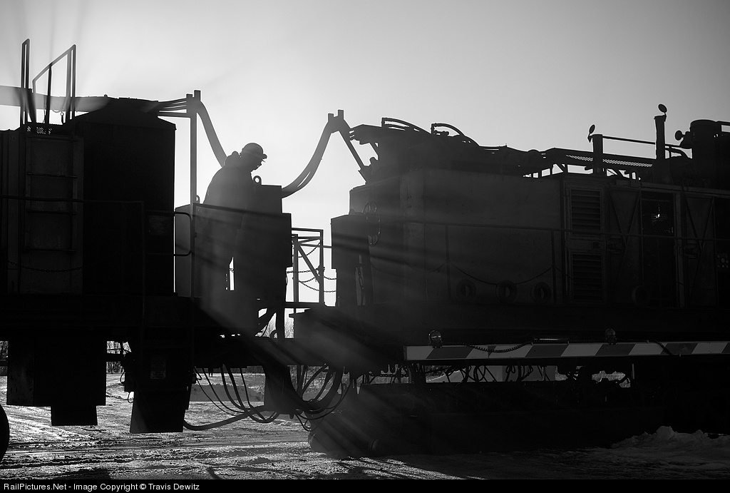 | A Loram crew member checks the work of his railgrinder as the grinding stones cause a wall of smoke to rise from the railhead. These tracks belong to the Canadian National's Superior Sub. |