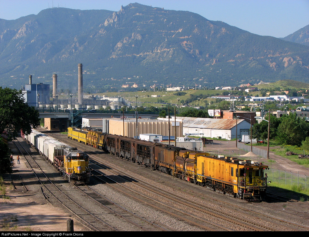 | With a rail grinder getting inspected on the right, the Union Pacific local goes about building its train before it begins today's work of industries in and around Colorado Springs while the Front Range looms in the background. |