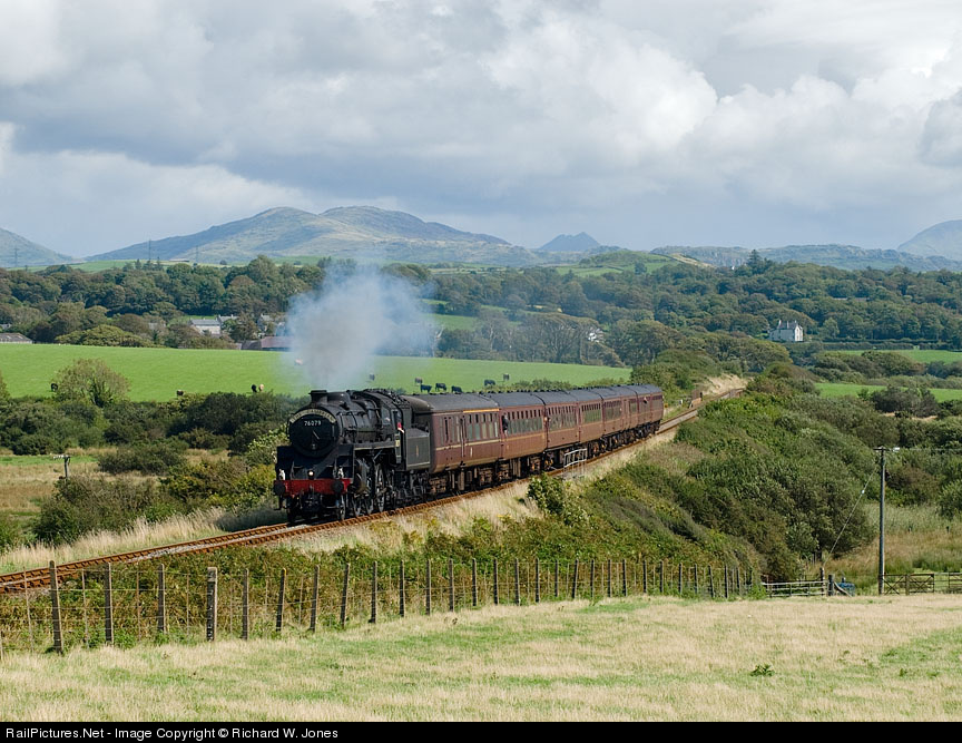 | It's just taken two years of effort to get a sunny shot on the stretch of line from Porthmadog to Pwllheli, such have been the past two summers. Standard Class 4MT no. 76079 passes Llanystumdwy with 8 coaches on the 1J77 10.04 Machynlleth to Pwllheli “The Cambrian”. |