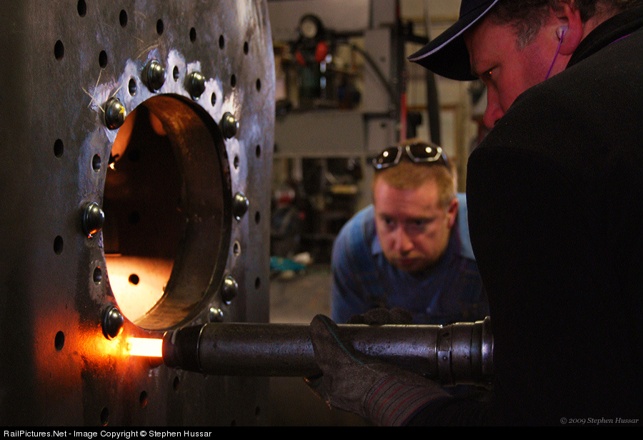 David Blackman of Boothbay Railway Village drives a hot rivet into the door ring of WW&F Ry No 9's new boiler. Meanwhile, out of view inside the firebox, BRV's Jason Lamontagne holds a buck against the rivet, and the pounding of the gun.