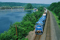 An EB autorack train (Conrail used the ML symbol) rolls thru the Mohawk Valley at Lock 14 on the New York State Barge Canal (Mohawk River). Power is two brand new C40-8W's.