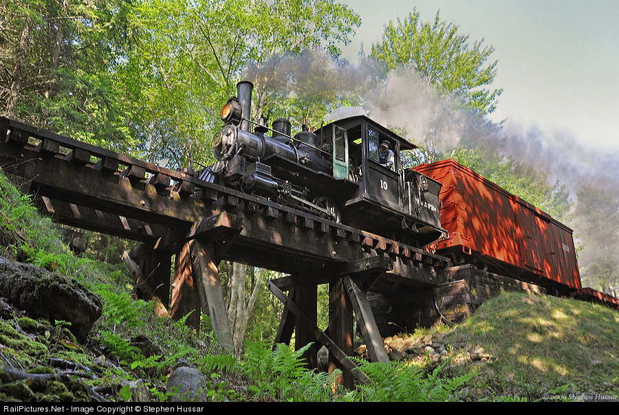 | WW&F Ry Museum Annual Picnic 2009. An early morning photo freight crosses Humason Brook Trestle heading south toward Sheepscot Mills Crossing. The trestle was designed by museum founder Harry Percival and is an exact reproduction of the original. It was constructed in 2001 by Marine Corps Support Squadron 472, Detachment B from Detroit as a training exercise. |
