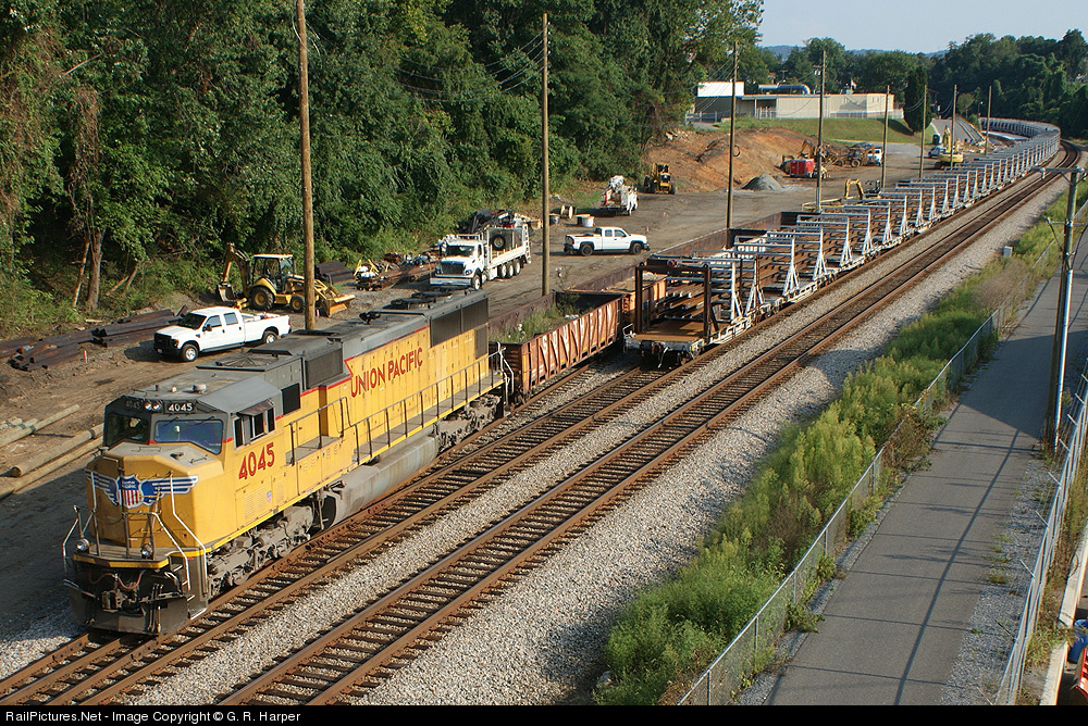| UP power on NS rail train 912 ducks into the storage track north of Kemper Street Station in lynchburg to retrieve a gondola car. Train has just set off four ribbons of 136 lb. CWR which will be used in the construction of the storage track for the Northeast Corridor train coming to twon October 1. |