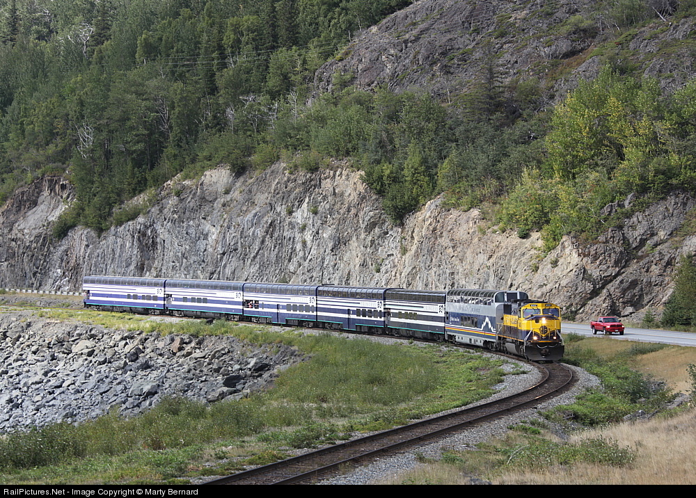 | The DEX (Denali Express) is operated by ARR for Princess Lines in the summer Whittier to Denali National Park and Denali to Whittier on Saturdays and Mondays, i.e., two trains, a NB and a SB each day. The trains are based in Anchorage and Fairbanks. This is the southbound headed toward Whittier. |