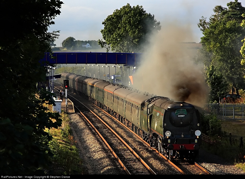 | Running 25 minutes late, during which time the sun went in, 34067 Tangmere catches the evening light at Kings Sutton while returning to London Victoria with a Cathedrals Express railtour from Stratford upon Avon. You can usually rely on Tangmere to produce some clag, even in warm conditions |