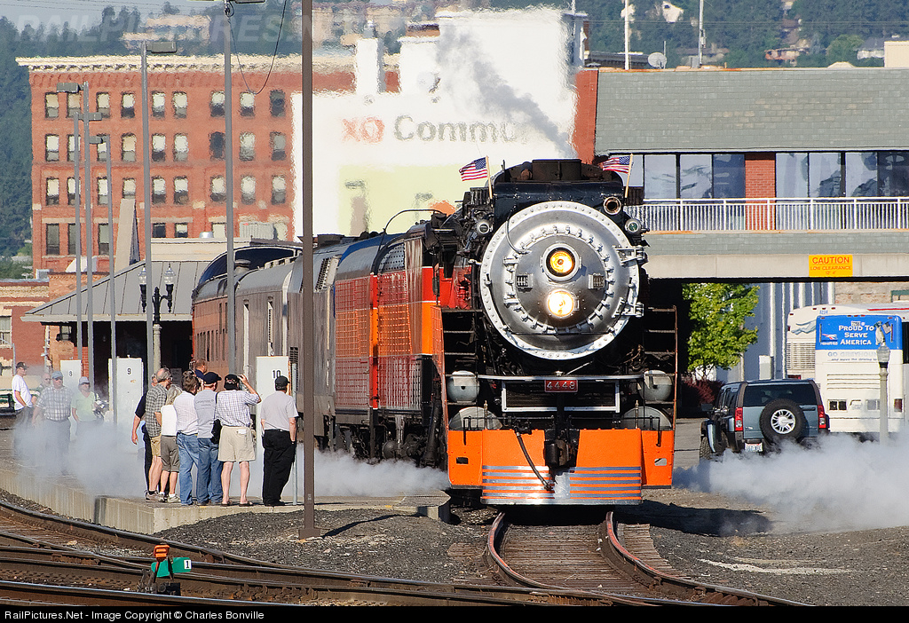 On Day 2 of the eastward journey to Train Festival 2009, SP 4449 proudly shows her Old Glories as she begins her departure from Spokane Station on a another bright and sunny morning. Today's journey will be on BNSF rails in three states--from Spokane, WA through Sandpoint, ID to Whitefish, MT.
