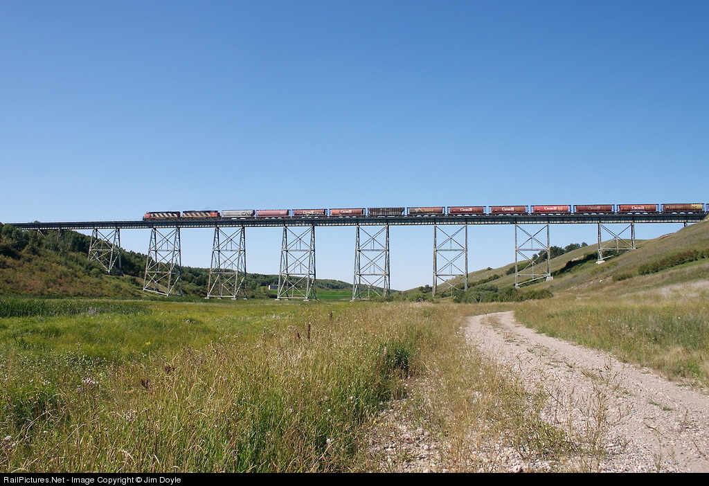 This train came off the Carberry sub at Petrel Junction and rolls west over the Cutarm creek bridge at Cutarm Saskatchewan. One of three large bridges of this type on the CN Rivers Subdivision.