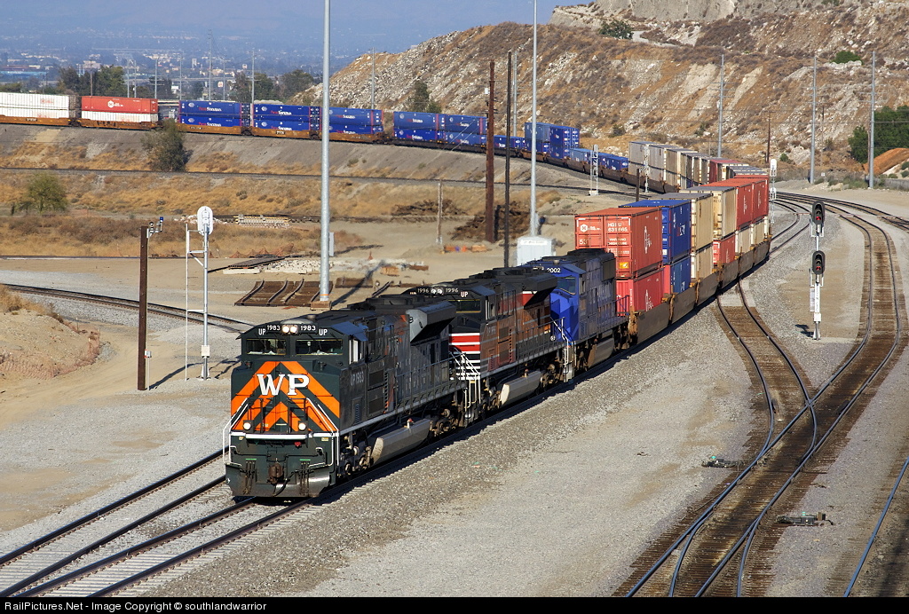 | Easing into West Colton after a trip down the Palmdale Cutoff, the WP and SP heritage motors plus the UP 2002 Olympic engine approach Pepper Ave. with the KG1LA-30 as a hoard of foamers click away on their cameras. |