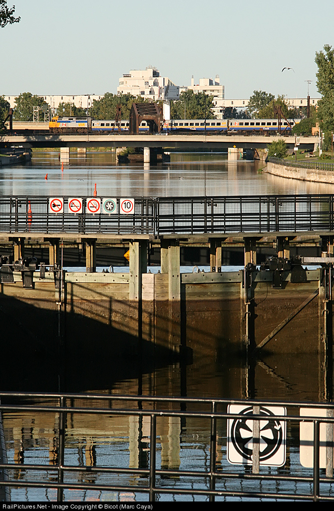 VIA 34 has dropped off it's passengers and is backing up to the MMC. In the foreground is one of the Lachine canal's locks.