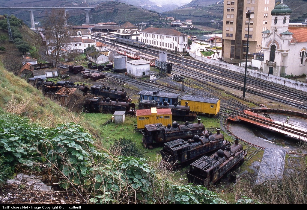 8 narrow gauge Mallet locos gradually rust away around the turntable at Regua. They had already been there for over 20 years! Note the 5 feet 6 inch gauge DMU in the station.