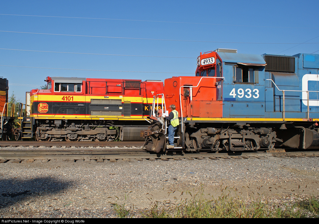 Old paint - New paint. Faded blue GTW power passes a newer KCS 4101 with a Southern Belle paint scheme.