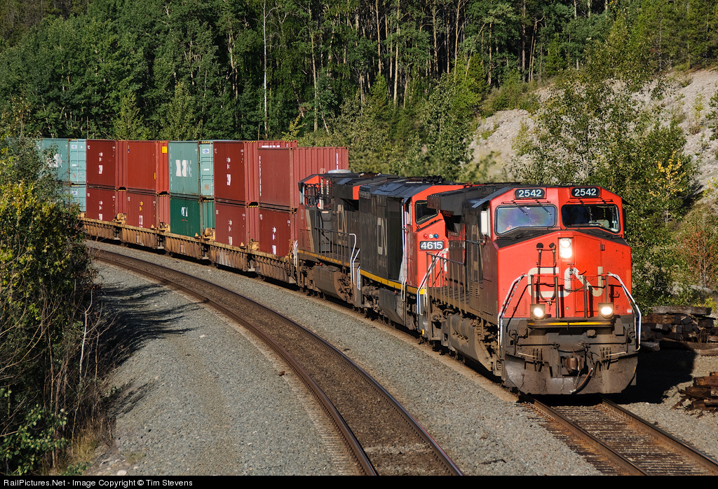 CN 2542, BCOL 4615 and CN 2281 lead 11,000 feet of containers into Jasper.