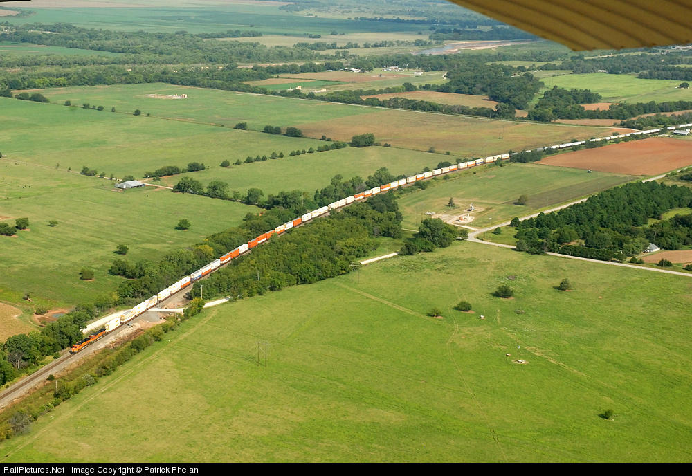 | A BNSF intermodal train speeds south on the former Santa Fe main through Oklahoma City toward Fort Worth and Texas, as seen from Cessna 150 N10681. Big thanks to Bart Y. for making train chasing with an airplane possible. |