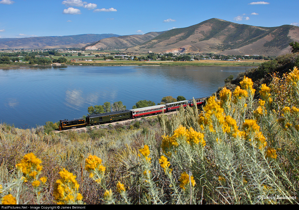 | It's a gorgeous afternoon to be trackside along the Heber Valley Railroad. Here RS4TC 4028 leads the 'Lakeside Limited' along Deer Creek Reservoir near Decker's Bay. The first passenger car on today's train has recently been restored and returned to service. It is a UP Harriman era combine, painted in vintage Pullman green livery with yellow lettering, and renumbered the UP 2700 'Chair-Baggage' car. |