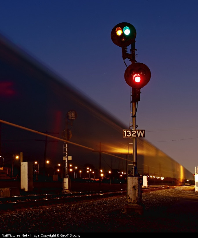 A grain train passes by the westbound MP 132 signal at Cooke Rd shortly after dark, on a nice clear night.