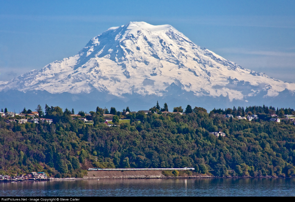 | The passenger's aboard Cascades 509 have just emerged from about a minute of darkness, to be treated to a great view of the Tacoma Narrows on the Puget Sound. But they can't see what we can... Mt. Rainier, with a fresh coat of snow from a recent weather system. Click Here for another view from across the Sound. . Taken from across the Narrows in Gig Harbor. |