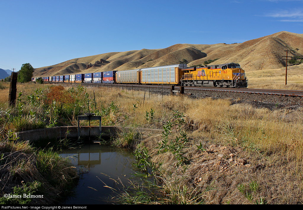 Oh, the wonders of distributed power in contemporary railroading! What at first appears to be the workings of a power short operator is in actuality a pair of diesel units working in tandem with a long train of containers in between. UP 7763 pulls the KOAMN-11 while a single SD9043MAC shoves the rear. It looks rather odd, but it seems to work well for UP, the 'Great Big Rolling Railroad' of the new century.
