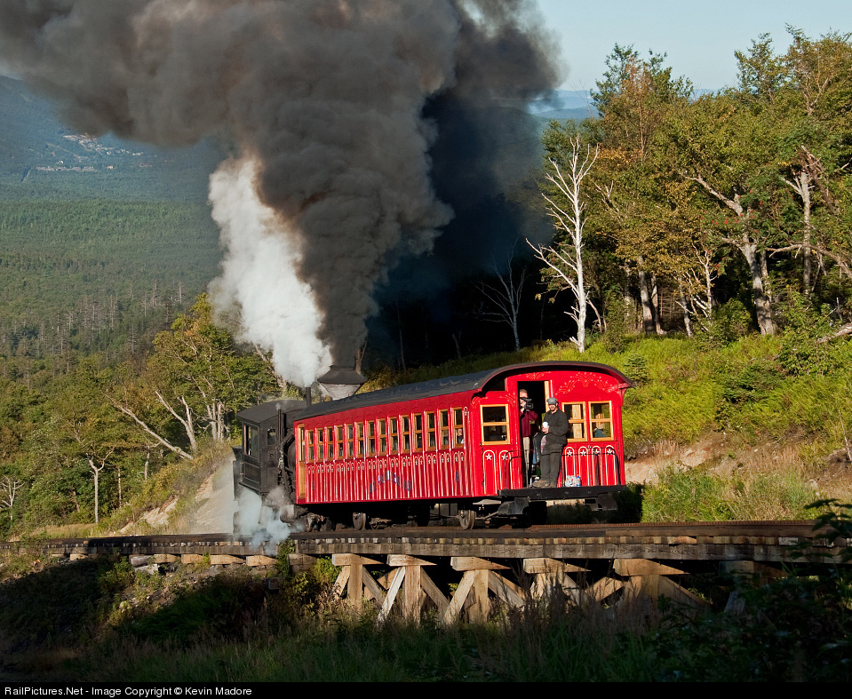 The shadows are long and there's a definite chill in the air as we find MWRC #9 "Waumbek" taking the early morning steam special up Cold Spring Hill, enroute to the summit of Mt. Washington. An amateur videographer can be seen on the platform, shooting over the shoulder of the Brakeman as he watches the track and sips his morning "cup of Joe". Note the wooden trestle over which the train is traveling. Because of the rocky and extremely uneven terrain, the entire 3-mile route of the Cog Railway is built on wooden trestle. While it minimizes the number of points of contact with the ground, it definitely increases the amount of inspection and maintenance necessary to maintain the right of way.