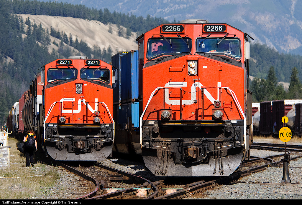 CN 2266 is ready to blast off from Jasper with Q111's train, while the crew for M301 boards CN 2271 to follow Q111's block west.