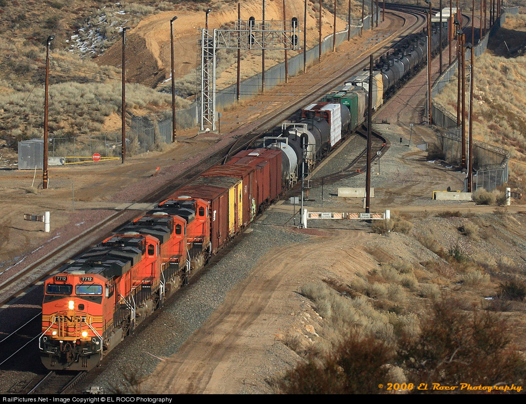 | A Winter Afternoon at Control Point Summit - BNSF #7712 leads a manifest train down the Cajon Pass towards the Los Angeles basin from Barstow California with the remainder of a pre-Christmas snow on the ground at EBCS Summit. I always find manifest, or “junk trains” as they are sometimes called more interesting than the more common intermodal Goliaths of the modern age. Seems junk trains remind me of my youth when I had less to worry about in general, and more time to stare at what went by on the tracks. |