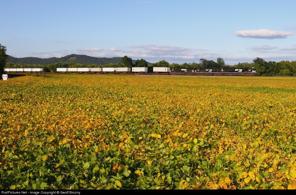 NS 218 having went in emergency about a mile away from this location, begins to pick up speed heading east, past the soybean field in the late evening light.