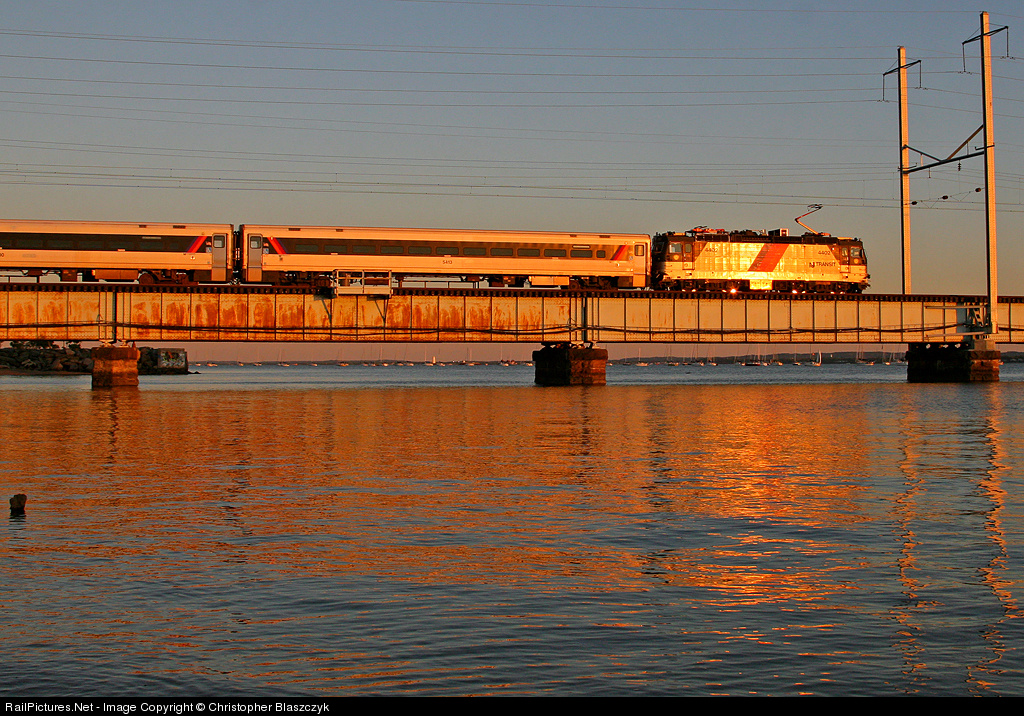 NJT 4402 shows off the commuter agency's new yellow-orange paint scheme as it shoves a northbound across the Raritan River a few minutes before sunset on a beautiful, late summer Saturday afternoon.