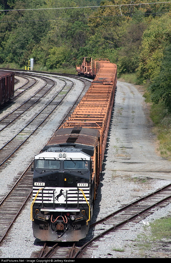 | An empty continuous rail train, tied down at the Bristol Yards, awaits it's next assignment. NS D8-40CW 8462 exLMS 722 |