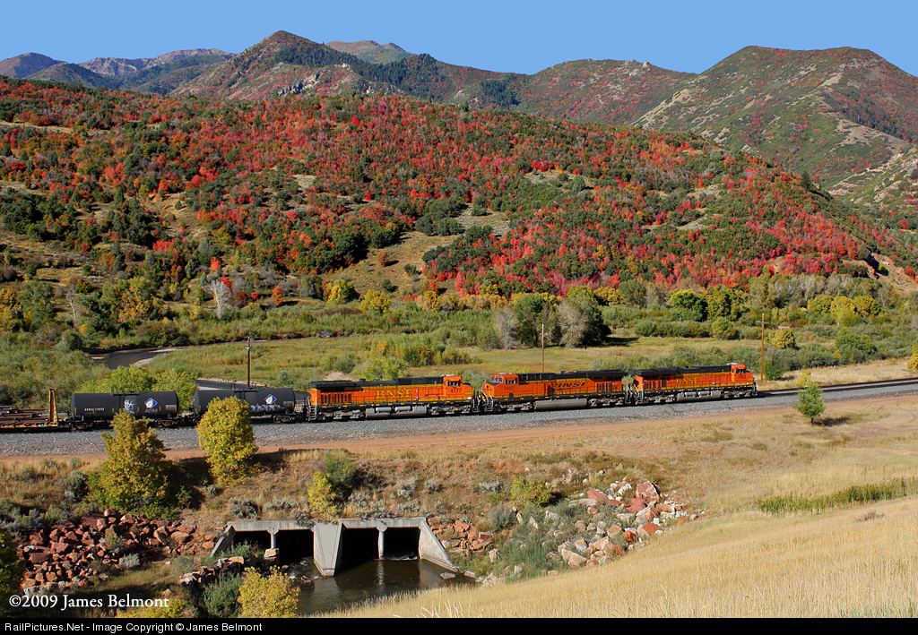On a spectacular first day of autumn, BNSF Railway's Denver, CO to Provo, UT manifest descends Soldier Summit through Spanish Fork Canyon near Castilla. The train is crossing a pair of culverts built in 1983 to allow the passage of the Diamond Fork River.