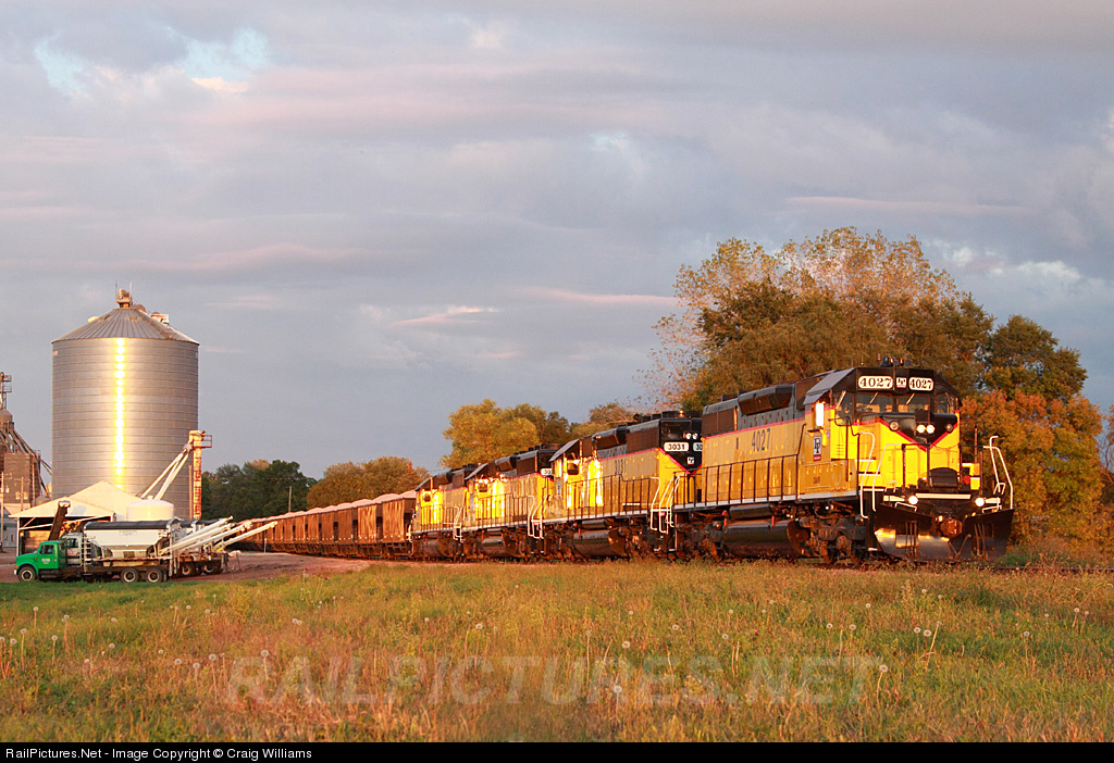 | A late rock train heads out of Dell Rapids at sunset. The train is enroute to Sioux City with 102 loads. 4 SD's will power this train for the 100 mile trip to Sioux City. At Sioux City 13 cars go to the BNSF and the rest in the yard for the D&I. With a rail gang working south of Canton this job has been working evenings but late loading of cars cause today's train to be even later. |