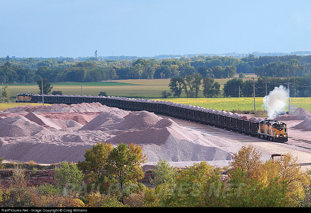 The Dell Rapids yard job begins the task of moving loaded rock cars back to the main yard on the northside of town. These cars will be weighed and then added to the outbound rock train heading to Sioux City tonight. This job uses a push-pull operation to make life easier to get across town.