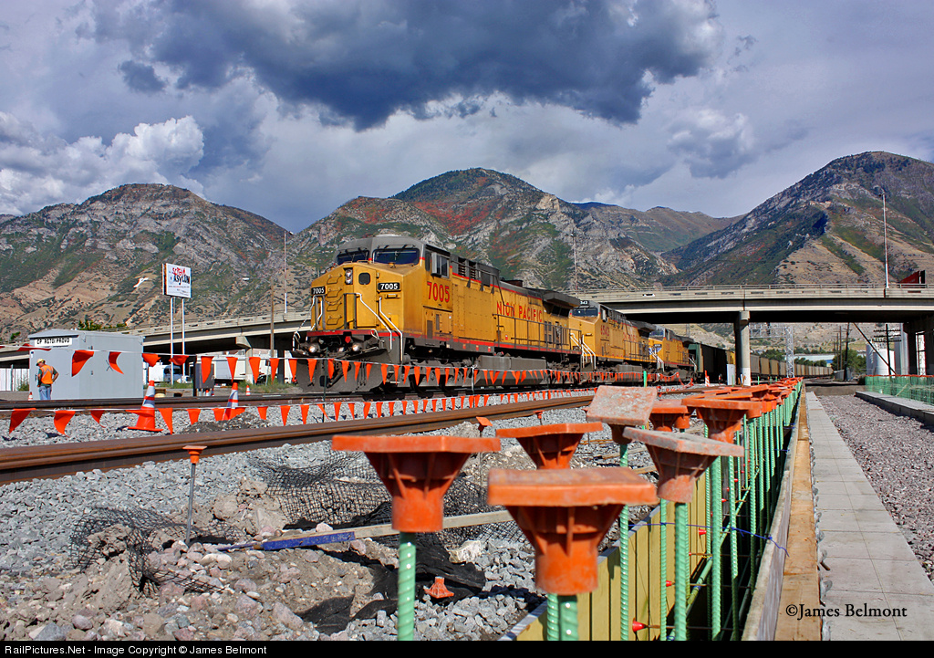 A Union Pacific coal train negotiates a major construction project at Provo, Utah. The Utah Transit Authority is currently building a new 45 mile commuter rail line from Salt Lake City to Provo. At right, the construction of a new station platform is underway on the site of an old team track. At left, Union Pacific MOW forces complete the installation of new CTC controlled double crossovers at University Avenue.