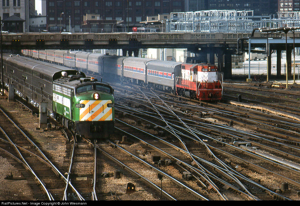 | BN Commutertrain with E8A 9923 leaves Union Station while Precision National Corporations GP 7 pulls an Amtrak composition out of the Station for a new arrangement. |