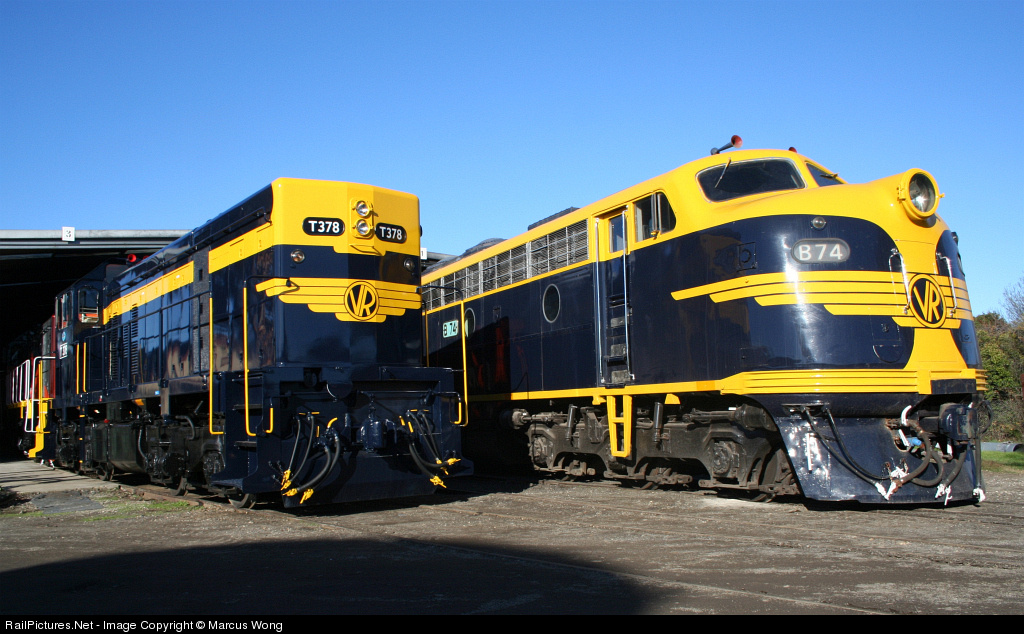 T378 freshly repainted into Victorian Railways livery stands alongside B74