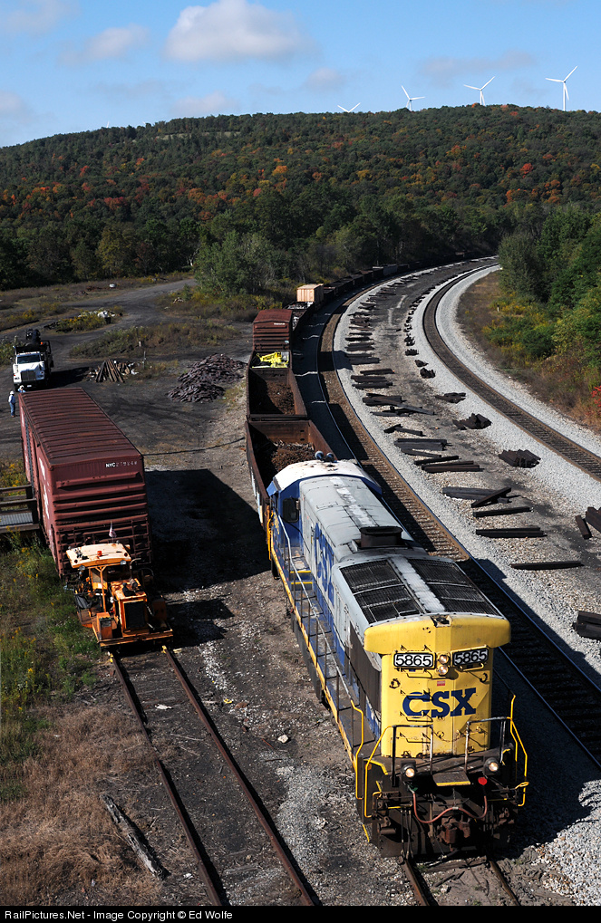 The conductor and maintenance foreman (partially visible behind boxcar) discuss the day's moves as an elderly B36-7 waits to switch cars out of No. 8 track at Sand Patch. Visible color in the trees at such an early date suggests fall may come early this year.