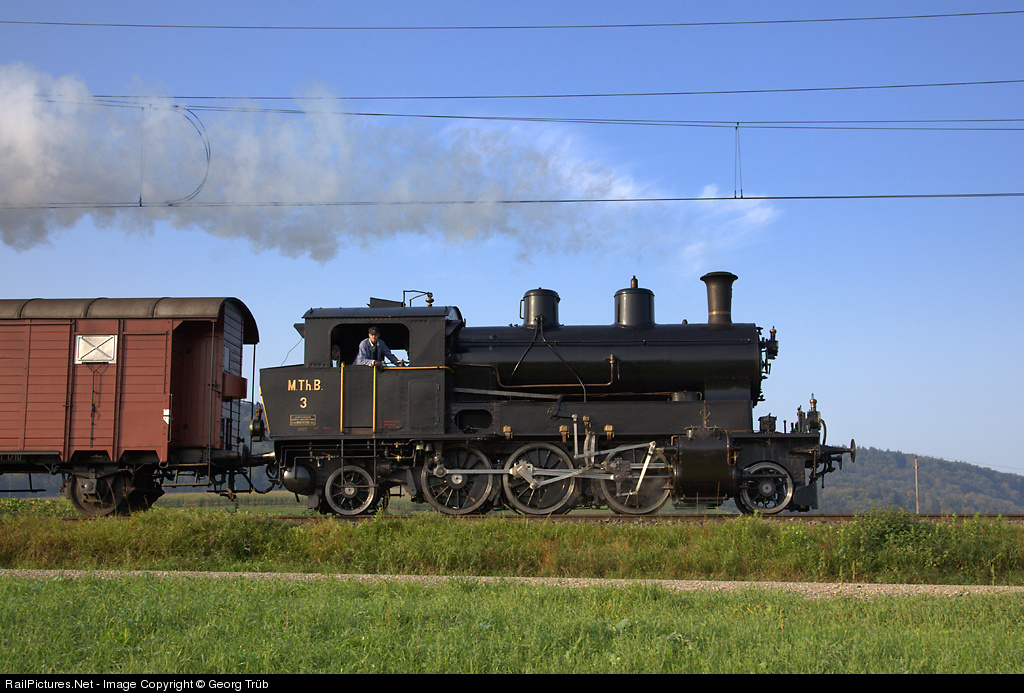 Tank steamlocomotive Ec 3/5 3 of the former Mittel-Thurgau-Bahn (MThB) was built in 1912 by SLM. Today she is operational for the association Historic MThB (VHMThB) and based in Romanshorn. With full speed she is on the way to Etzwilen for special trains on the line to Ramsen.