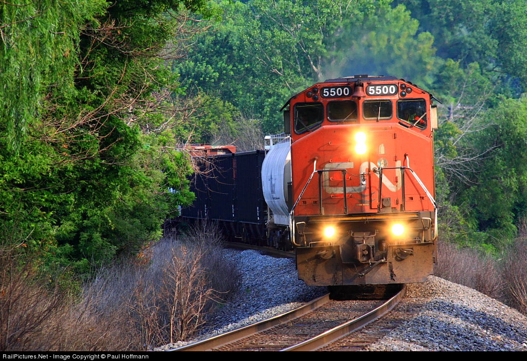 | Class locomotive CN 5500 leads southbound manifest in the small town of Silver Lake just south of Burlington, WI before heading accross the state line into Illinois. |