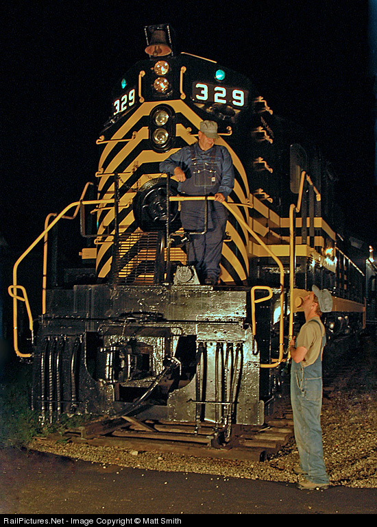 Late fall 1957 finds recently delivered NKP RSD12 329 at the Bellevue roundhouse, as a couple of hostler's talk about the nights move's ahead, including moving 329 to the ready tracks for forwarding to its train. From the first "Night Photo Sesson" at the Mad River & NKP Railroad Museum.