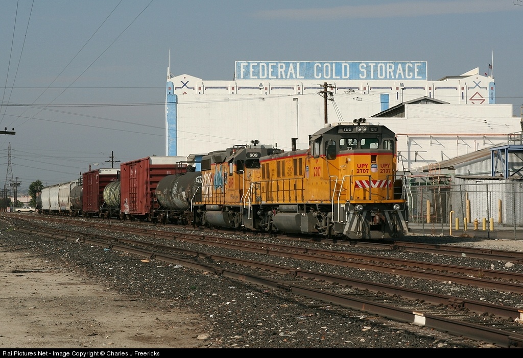 | The "South Industry Job" awaits its afternoon remote crew on "The Federal" (a siding just south of the LAJ Crossing on the once mighty Los Angeles & Salt Lake). This job will do the South Industry Work on the north end of what is now the UP San Pedro Subdivision in Vernon CA, and then bring the empties back to the "Weeds" section of East Yard for tonight's MLAWC to West Colton. The other sidiing, closer to the camera, is the Fruitland Siding. |