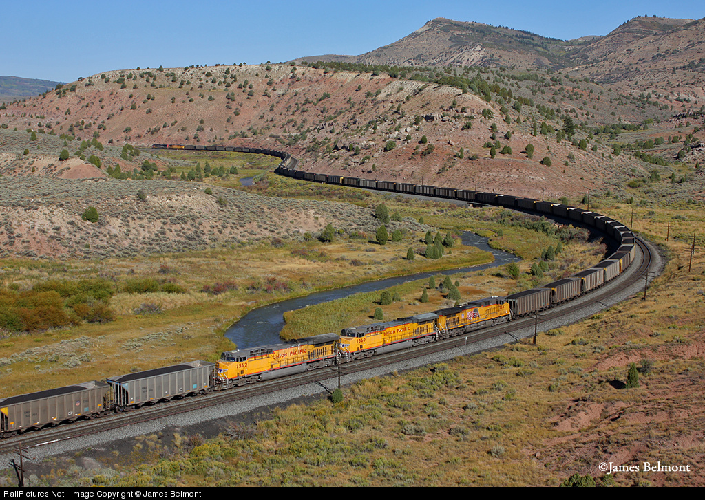 With a mid-train helper cut in, a load of Colorado coal ascends the Price River Canyon grade just west of Kyune, Utah. This train originated along UP's North Fork Subdivision at Somerset and it's journey will end at the Intermountain Power generating station near Lynndyl, Utah.