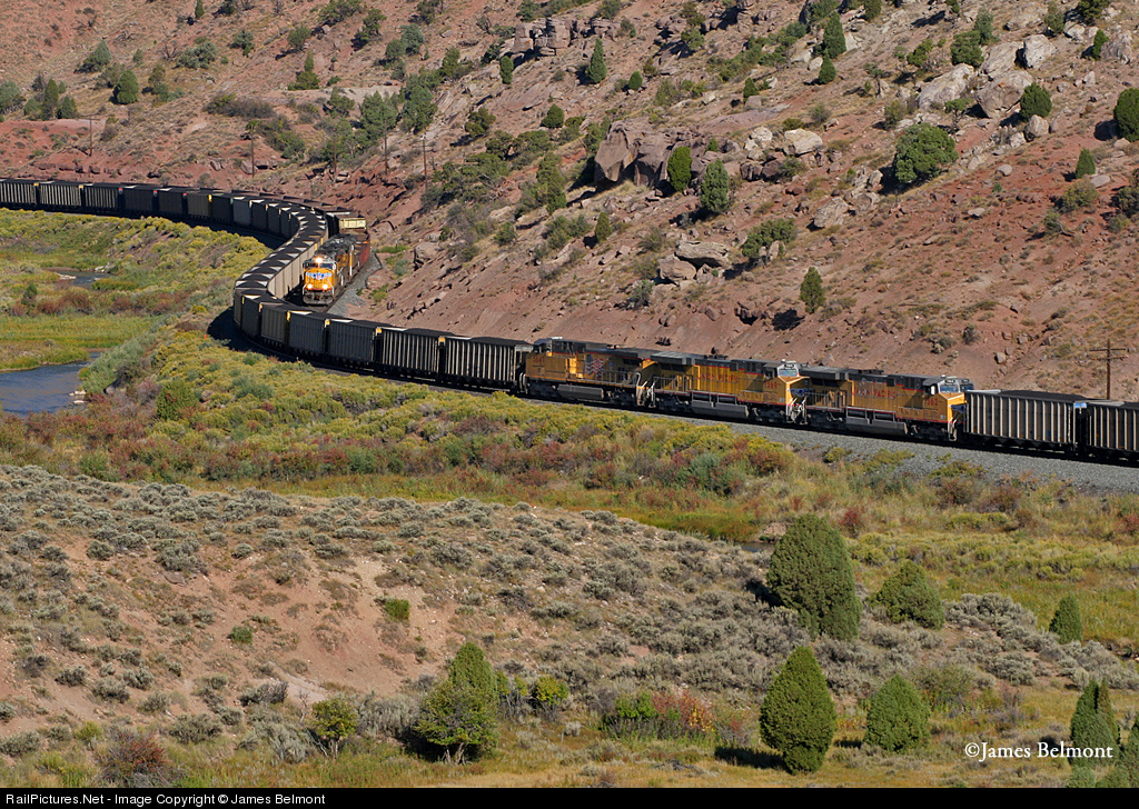 | Union Pacific's Salt Lake City, UT to Denver, CO manifest meets a Somerset, CO to IPP, UT coal load (with manned helpers) just west of Kyune, Utah. |