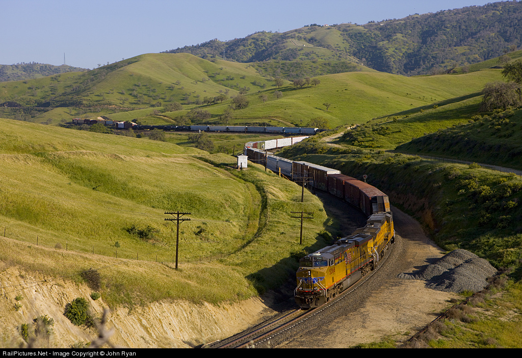 The crisp winds of October herald a change in seasons, leaving me longing for warm, sunny days. Back in spring, when the hills were bright green and the flowers were blooming, two DPUs lean against a southbound train as it negotiates the twists and turns of Tehachapi Pass.