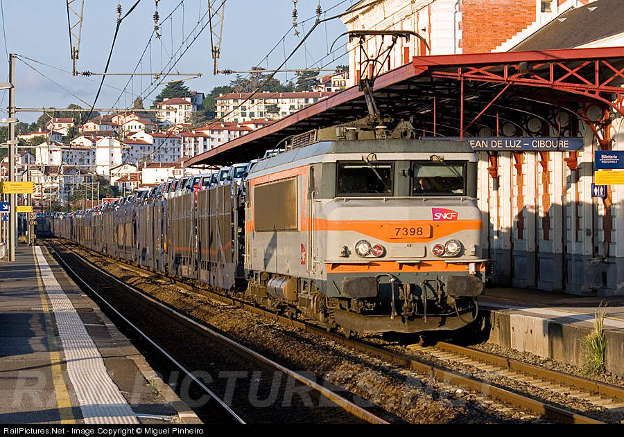 | BB7200 series with a freight train from Hendaye, running to Bordeaux with a big load of cars from a Spanish factory |