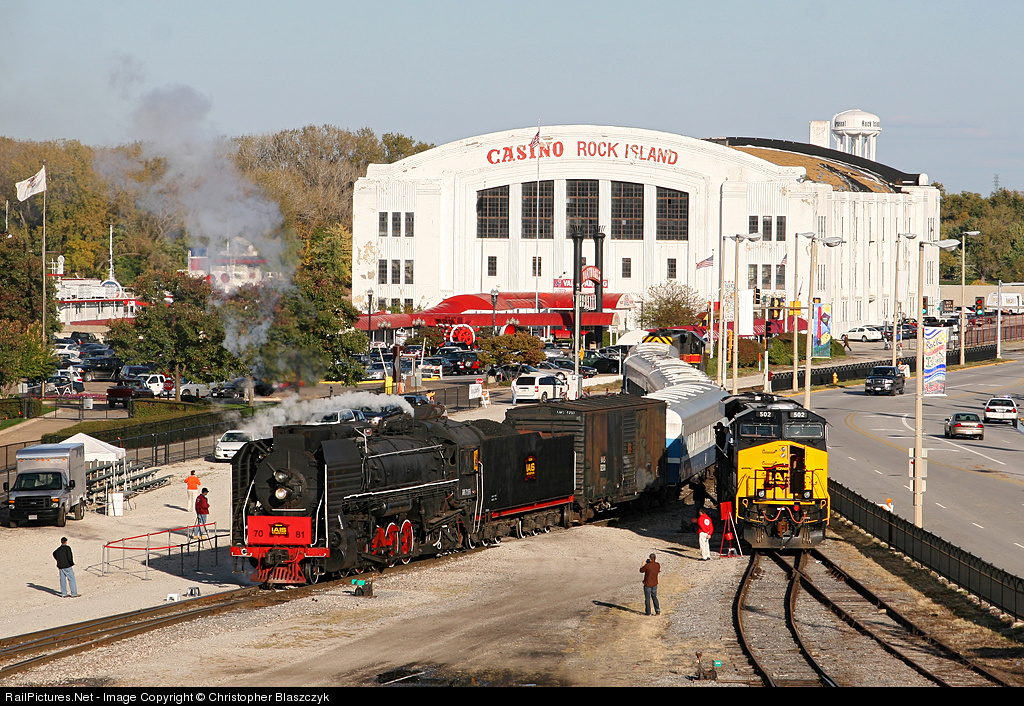 | The casino in downtown Rock Island (one of 9 in the state) looms in the background as Iowa Interstate 2-10-2 7081 arrives back in town from Walcott, Iowa, with an excursion for Midwest flood relief. Brand new ES44AC 502 was put on display for the weekend. |