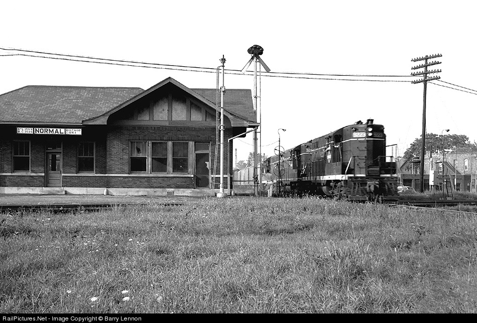 The Normal depot operator, silhouetted in the doorway, informed the crew of this southbound that the arrival of a GM&O passenger was imminent. He told them that they could hold out north of town, or…”make a good move” across the diamond. They chose the latter, and judging by the motion blur of the lead unit and the flying dust, they were going just a wee bit “over the posted”. Barry Lennon Sr. photo. Barry Lennon collection.