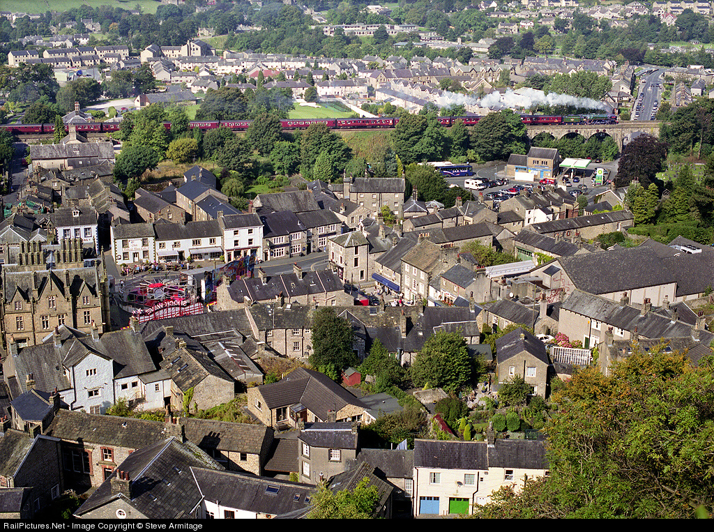 Photographs of the famed Settle and Carlisle route seldom feature Settle itself. Castleberg rock, a crag set 300ft above this ancient Yorkshire market town gives offers a wonderful panorama across the rooftops. 'The Hadrian' special is being hauled by 'Britannia' Pacific No.70013 'Oliver Cromwell'. Settle has medieval origins and many fine and ancient buildings remain in the town set alongside the River Ribble. A funfair is being dismantled in the market place onto which the white frontage of 'Ye Olde Naked Man' cafe faces. Ah, the delights of Yorkshire!