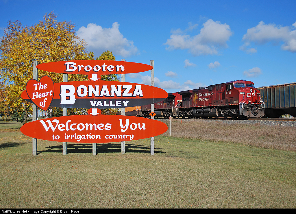 | Combine a rejuvenated local economy due to the introduction of center pivot irrigation by farmers in the area and the popularity of a particular TV show, and there you have the reason why Brooten dubbed itself "Heart of the Bonanza Valley" in the 1970's. While the optimism of that time has been tempered by the farm crisis of the 80's and continued population decline in the 90's and 2000's, there's still a "bonanza" on the Soo Line rails through town, evidenced by the passage of CP train 198. |